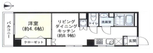 こちらが約8.9帖のリビング・ダイニング・キッチン+約4.6帖の洋室。奥の洋室の扉を開けて二部屋をつなげた様子です。洋室には南向きの大きな窓がありますので、普段はこのようにワンルームとして使って、必要に応じて仕切って使うのが良さそうです。