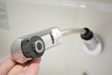 水栓は浄水機能付きシャワー水栓。切替えるだけで気軽に美味しいお水を使う事が出来ます。ヘッドが伸びてシンクを流したりにも便利です。