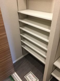 玄関の照明には人感センサーが付いていて自動的に照明を点灯してくれるので、真っ暗な中手探りでスイッチを探すなんてこともありません。我が家も使っているのですがとても便利ですよ。ただ、ドアを開けた時にはもう明るくなっているので、たまに誰もいない部屋に向かって話し続けたりしています(笑)玄関にはトールタイプのシューズボックス、隣には収納が設置されています。お部屋以外の収納が豊富なのは嬉しいですね。