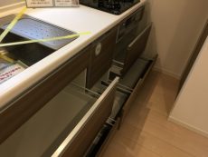 浄水機能付きの水栓に3口コンロ、食洗機付きとスペック◎!シンク下の収納は、スライド式なのでキッチングッズの収納も楽々 (●´∀`)配管を気にせず収納できるので大容量。
