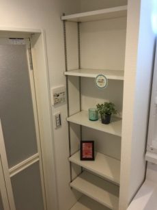 洗面台横には、大きめのリネン庫!!いっぱいタオルを置けますよ~(*´▽`)