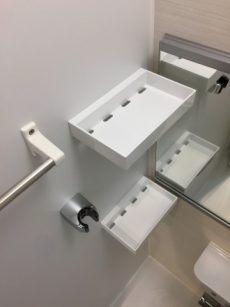 バスルームは、ホワイトの木目調のパネルが使われています。ミラー横のポケットにシャンプーボトルなどの小物をしまえば見た目も使い勝手もバッチリ◎