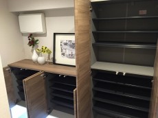 玄関左手には大きなシューズボックス♪♪ロータイプ×トールタイプで大容量です。ご家族全員分の靴からスリッパやちょっとしたシューズケアグッズまでまとめてこの中に仕舞っておけそうです。上部はカウンターになっていますので、お気に入りのインテリアやお花を飾って華やいだ空間に。