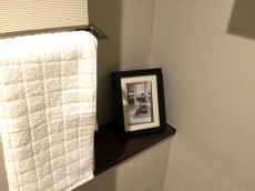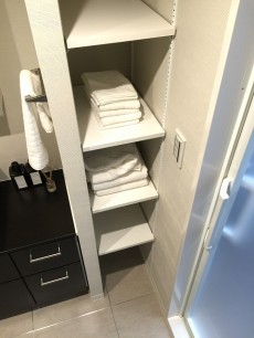 バスルームの出入り口にはコンパクトな収納棚があり、リネン類の収納はバッチリです。