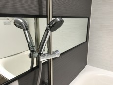 バスルームは、グレーとホワイトのパネルを使って落ち着いた空間♪♪ミラーの下には棚も付いているので小物を置くスペースもあります。