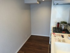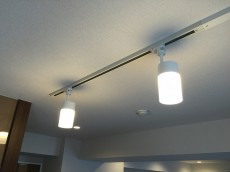 ゆとりのあるスペースで、冷蔵庫を置くスペースもしっかりと。上部にはライトをレール上の好きな場所に移動できるライディングレールが設置されています。