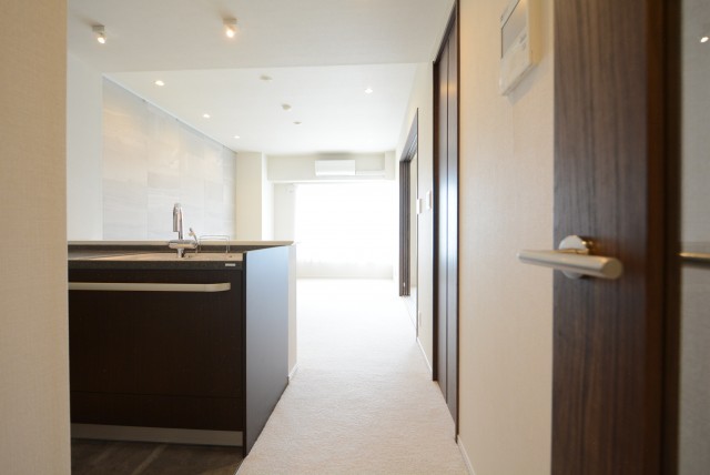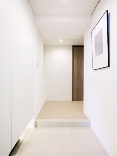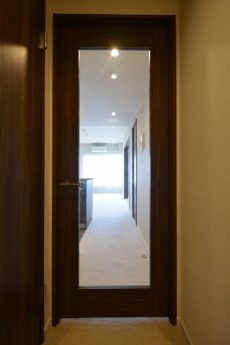 玄関ドアを開けると正面には扉が…廊下は左にずれた所から伸びていました。このタイプは玄関からお部屋の中が見えづらくていいんですよ。宅配便やフードデリバリーなどが増えている、今の時代にマッチした造りですね。