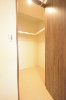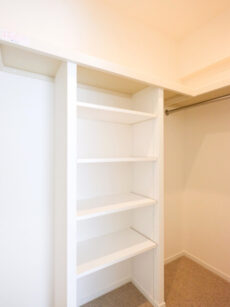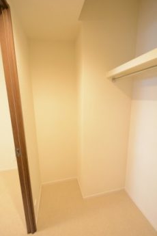 ウォークインクローゼットになっていました。L字型にハンガーパイプが設置されています。床面も広いので、衣装ケースなどを置いても良いかもしれませんね。