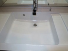 洗面化粧台もファミリーサイズ。継ぎ目のない洗面ボウルには、ウェットエリアも