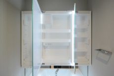 安心して置いておけます。三面鏡の裏側はキャビネット収納になっているのに