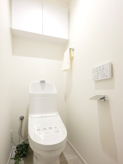 トイレはもちろんウォシュレット付。上部には大きめの吊戸棚が設置されているので、