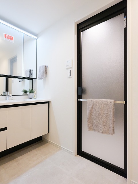 【洗面室:三面鏡付き洗面台・浴室・洗濯機スペース】