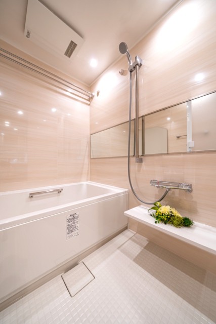 浴室は白とベージュの優しい色使い。柔らかな雰囲気でリラックスしたバスタイムを過ごせそうですね。新規交換の給湯器はワンタッチでお風呂を沸かしてくれます。更に追い焚き機能で保温までしてくれますので、いつでも温かいお風呂に入れますよ。浴室乾燥機付き!雨の日のお洗濯物もお任せ下さい。