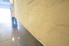 内部の床はタイル貼り、腰の高さまでは石張りで、上はデザイン性の富んだオシャレな壁です。