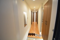 なかへ入ると、木調フローリングの廊下がリビングまで続いています。