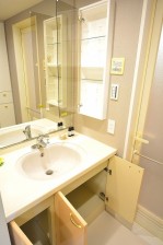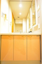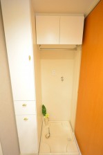 左側に洗面台、右側にランドリースペース、正面にバスルームになっています。