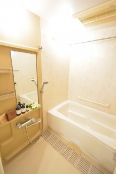 バスルームもリフォームされており、シャワーヘッドと水垢の目立つ鏡は交換されています。