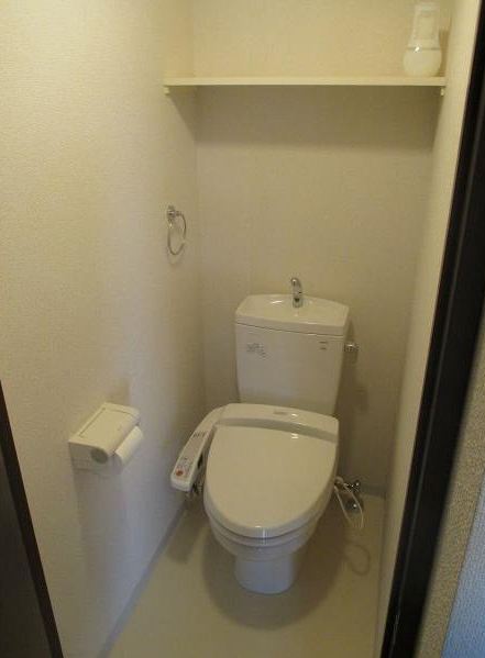 右側のドアがトイレです。ウォシュレット付で上部には棚があるので、上手に活用してくださいね~(^v^)