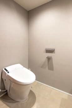 タンクレストイレはLIXIL製の洗浄機能一体型。なんと立派な洗面台も付いています。洗面台下には、トイレットペーパーのストックや掃除道具などいろいろ入って便利ですよ。