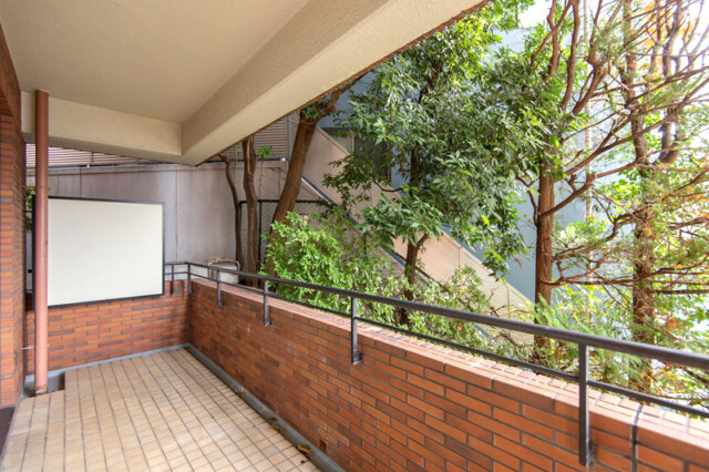 広さは11.17㎡、南東向き。奥行十分な広々としたバルコニーです。緑豊富で自然を間近に感じられますね。赤レンガ風のタイルもよく合ってます。