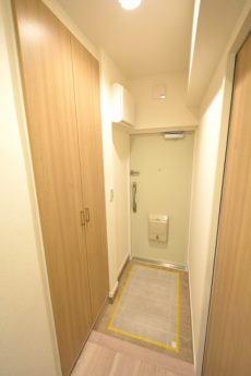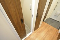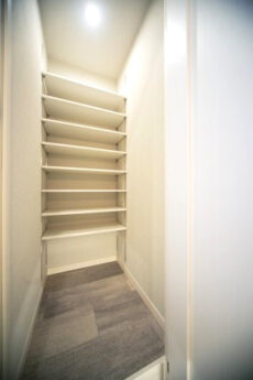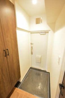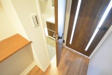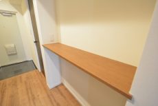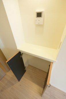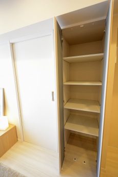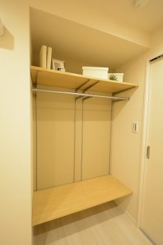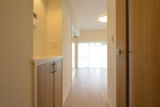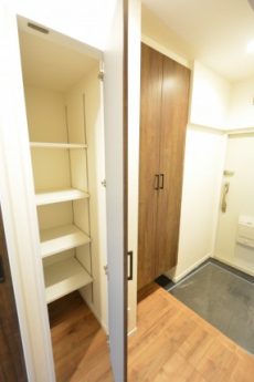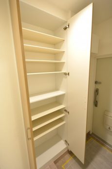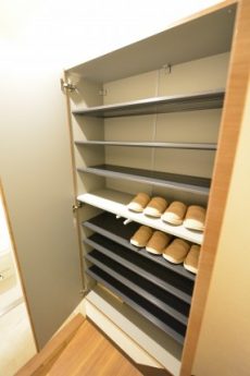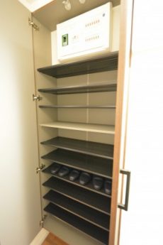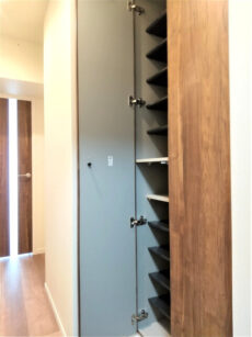 入って左の上がカウンターになったシューズボックスの他に、右側にはシューズボックスが設置されています。奥行きがあって靴以外のものの収納にも役立ちそうです。