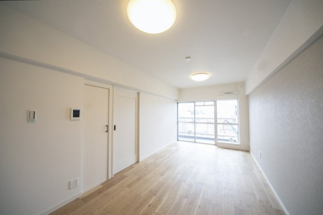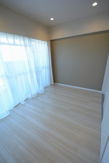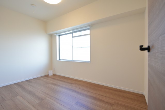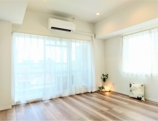 北東向きのバルコニーに面したお部屋です。中間調のフローリングと白のクロスのナチュラルな雰囲気。色使いがシンプルなので家具やカーテンも合わせやすそうですね。アクセントウォールにも邪魔にならないグレーをチョイスしています。