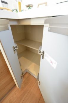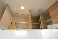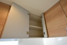 棚部分の一か所だけあえて戸をあけておいて、見せる収納にするのもアリかもしれません (*^艸^)