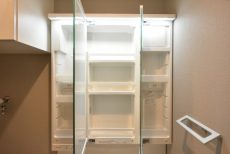 大きな鏡の内部は収納、洗面台の下もリネン庫として使うことが出来ます!