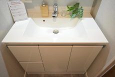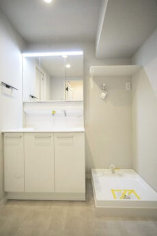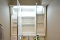 洗面室には洗面化粧台の他に洗濯機スペース、トイレ、浴室がまとまっていて脱衣室も兼ねています。洗面化粧台は身だしなみチェックに便利な三面鏡付き。裏がキャビネットになっているので、洗面周りに散らかりがちな細々したものもスッキリと片付けることが出来ますよ。トイレは洗浄機能一体型。