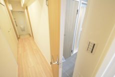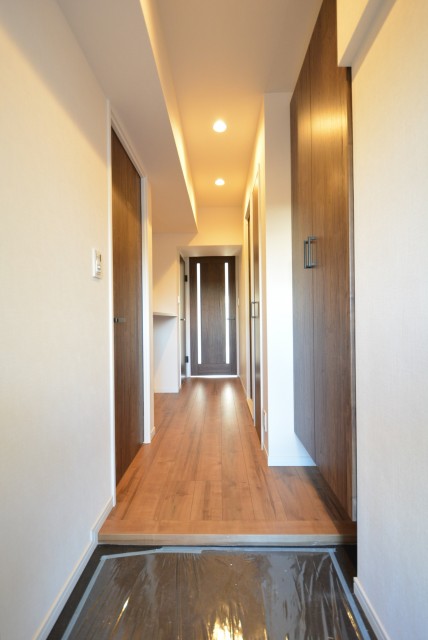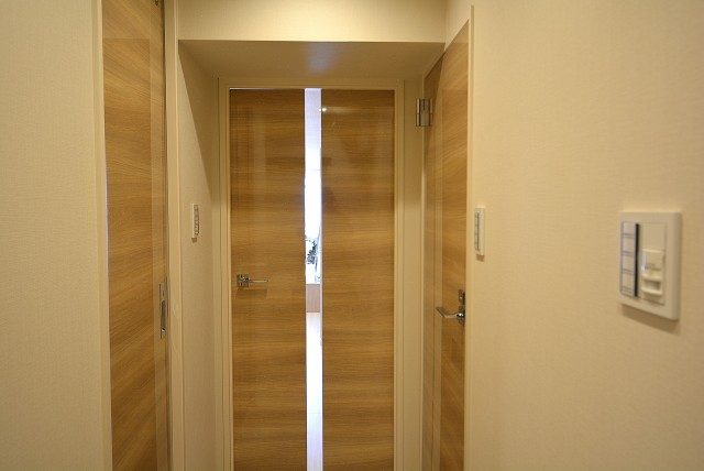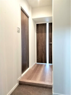 玄関からは短めの廊下が続いています。真っ白な壁や建具に黒の金具がいいアクセントになっていますね。照明には人感センサーが付いているのでいつでも明るい玄関が迎えてくれますよ。