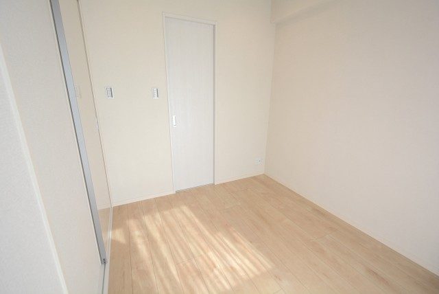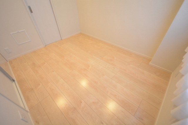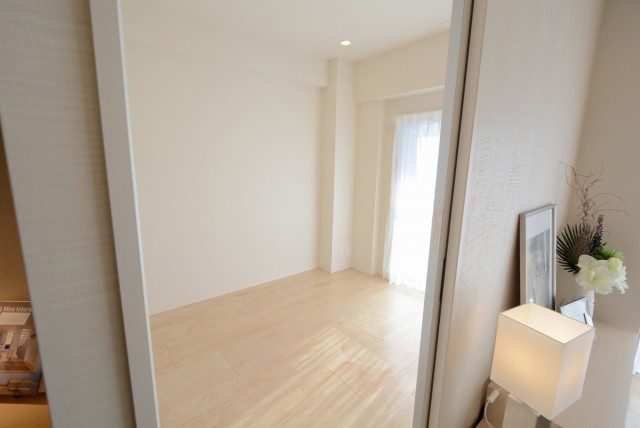 玄関をあがり、すぐ左側にある洋室。約6.5帖。一部だけ柱が少し出ているので反対壁面側にベッドや家具を配置するのがよさそうです。
