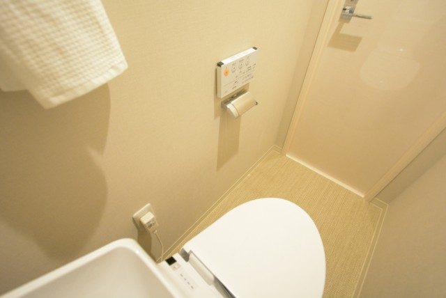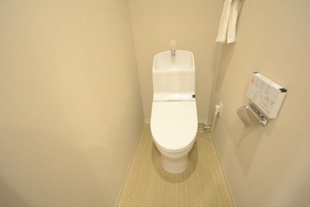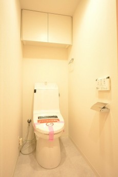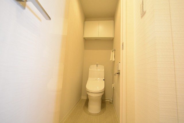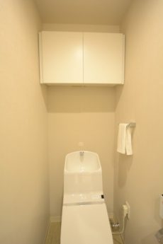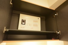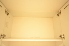 上にはペーパーのストックや掃除用具の収納に便利な収納棚が設置されています。