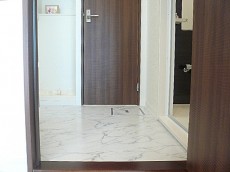 白を基調とした明るい玄関ホールです。左側には高さのあるミラー付き玄関収納があります。