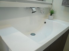 洗面化粧台です。大きなミラー三面鏡の扉を開くと細々したヘアー飾りや化粧品などもキレイに整理整頓できそうな収納です。おしゃれな洗面ボウル両サイドにはスペースもあり、コップやハンドウォッシュなどが置けそうです。