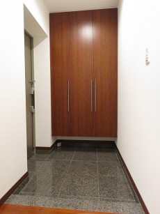ゆとりのある玄関ホール。家族一緒に出掛ける準備をしても渋滞にならずに済みそうな感じです。横に設置されたシューズBOXは傘も仕舞えるタイプです。