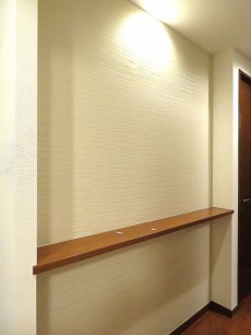 向い合せの位置に長いカウンターと棚付の廊下収納があります。植物やインテリアをカウンターへ、シューズBOXに入りきらない靴やお客様用のスリッパ、日用品のストックなどを収納に仕舞っておくとよさそうです。カウンターに何を置こうか考えるのも楽しいですね♪