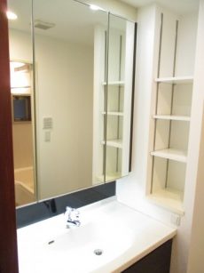 洗面化粧台は鏡の裏、引き出しと収納豊富。カウンター部分も広々しているので、身支度もしやすいですね!