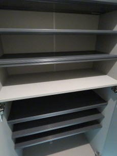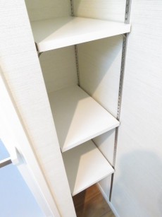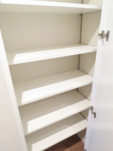 トイレはウォシュレット付き。珍しくトイレ内も廊下や洋室と同じフローリングになっています。後ろの戸棚にはペーパーのストックや掃除用具をどうぞ。