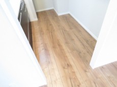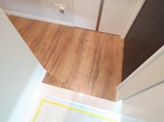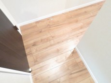 洗面室内もフローリング。洗面化粧台、バスルームがはいっています。