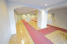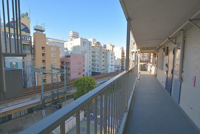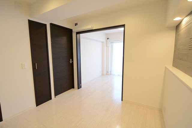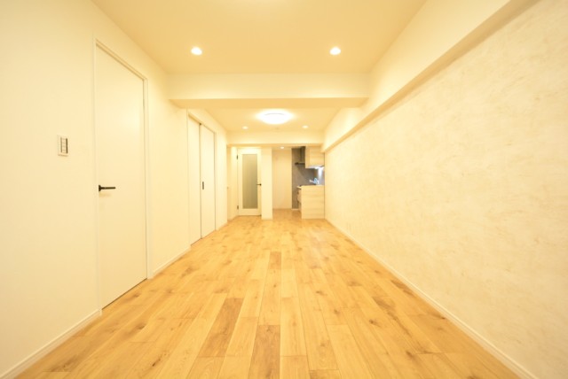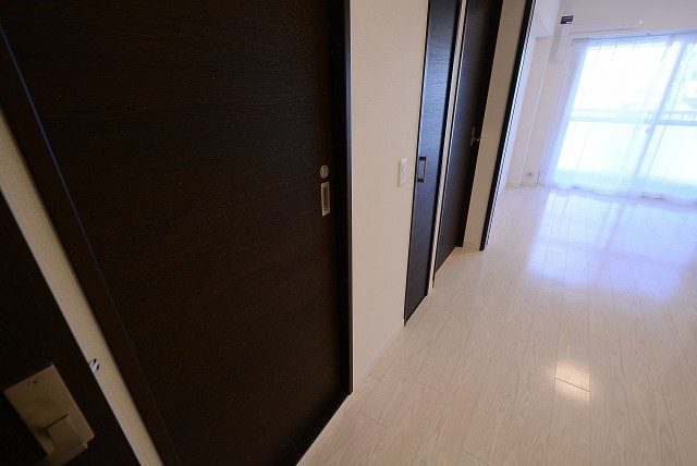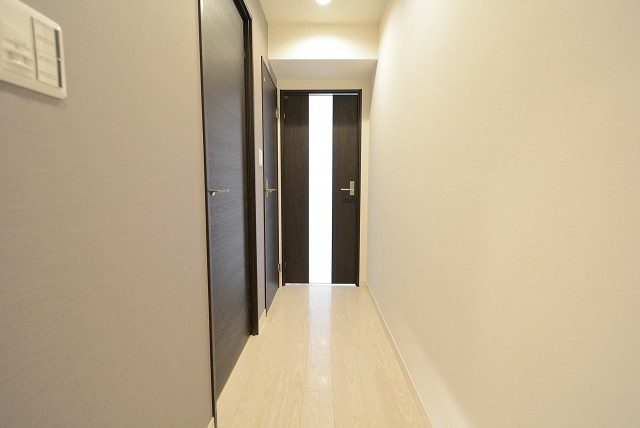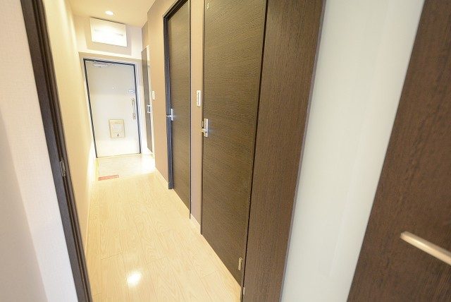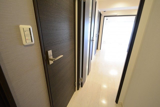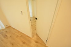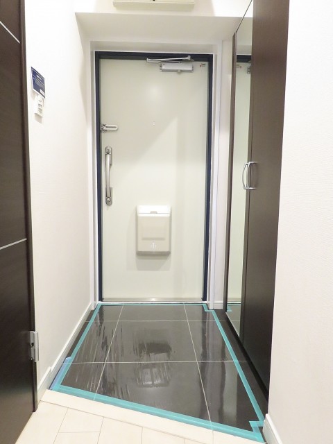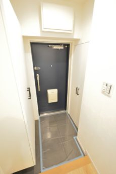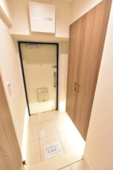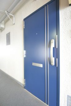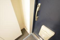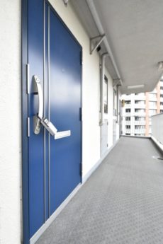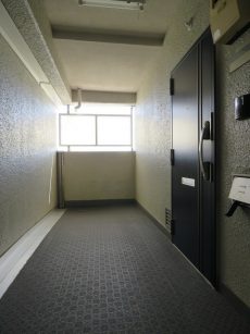 玄関前。角部屋なのでお部屋の前を通過する足音などが気にならないで生活できるかと思います。マンションにオートロックはありませんが、お部屋にはTVモニター付きインターホンが設置されています。来訪者の顏が事前に確認できて安心です。