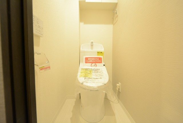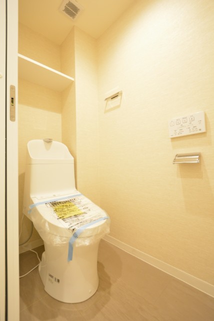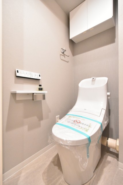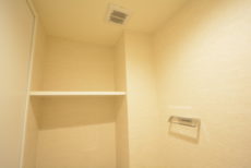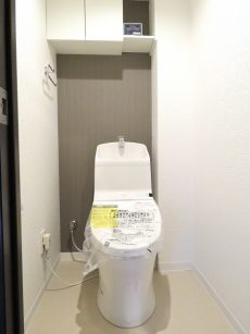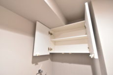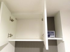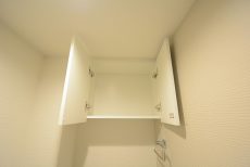 ウォシュレットとトイレットペーパーのストックなどを仕舞っておくのに便利な吊戸棚が設置されています。