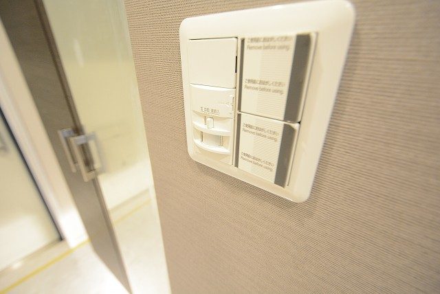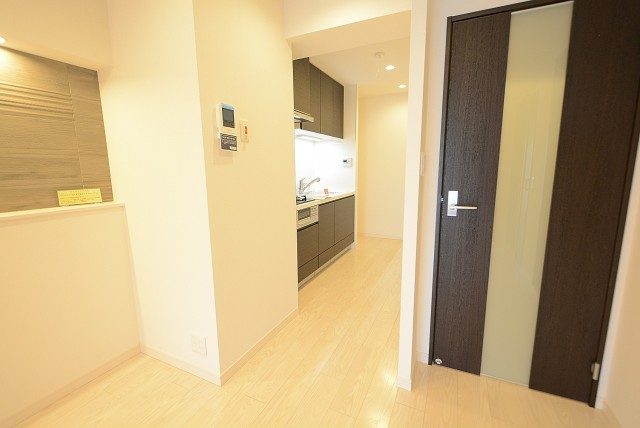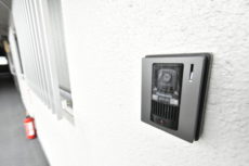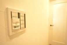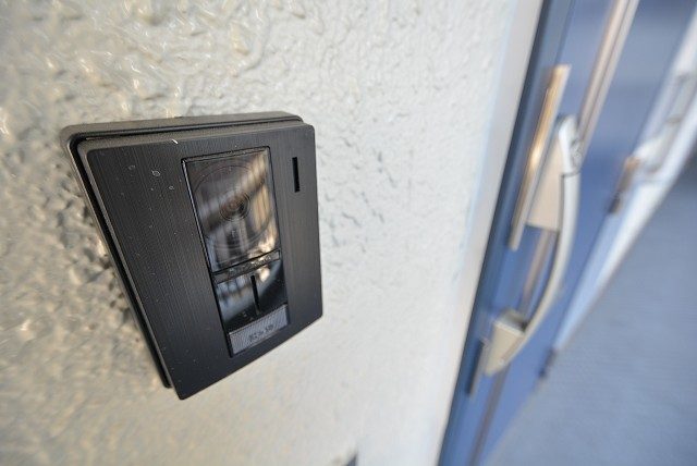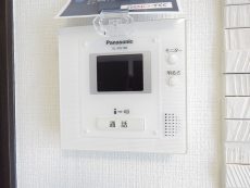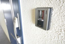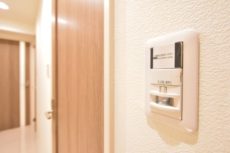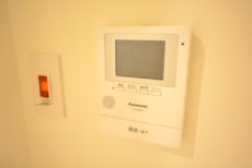 玄関ドア横にはモニター付きインターホンが設置されていて、お部屋の中から訪問者を確認する事が出来ます。わざわざ玄関まで来なくていいのは助かりますね。ドアスコープってちょっと怖いですし^^;)