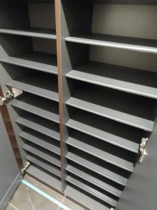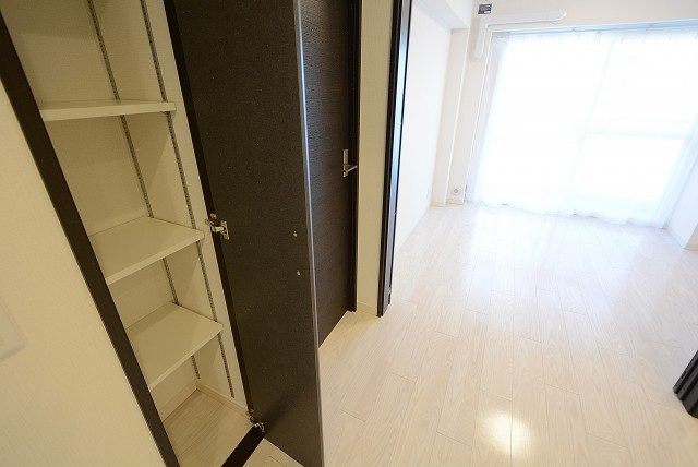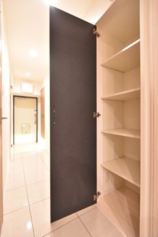 廊下へ戻って、すぐ右側には収納棚。棚は可動式なので大きな物もお任せ下さい。