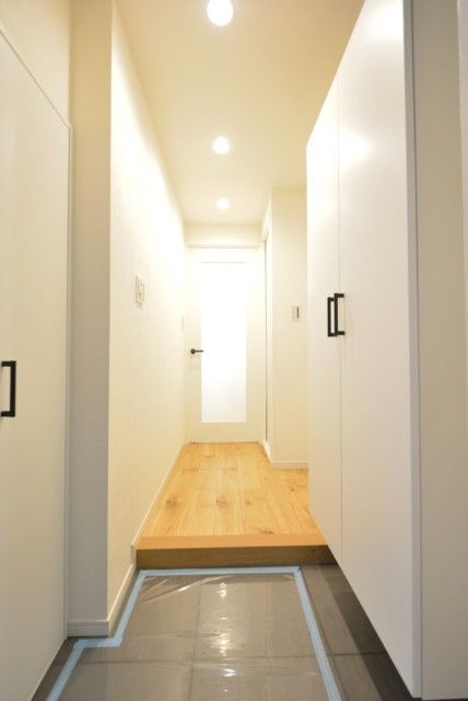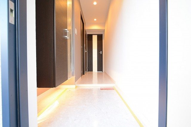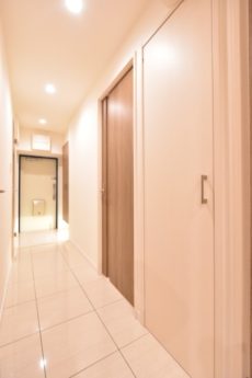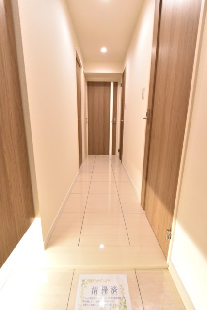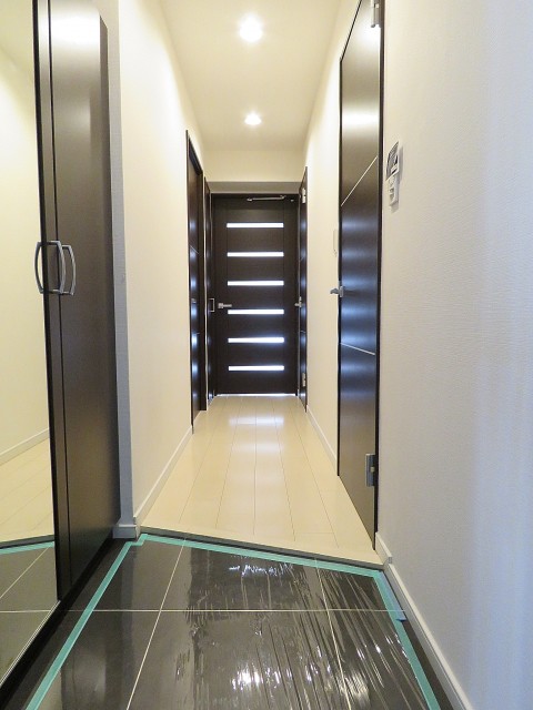 玄関から続く廊下は光沢のあるタイル貼り。高級感と共にお掃除も楽々です♪ 濃いめの色の建具で落ち着いた雰囲気ですね。