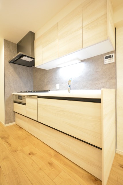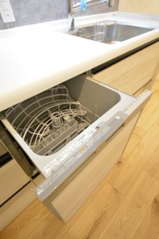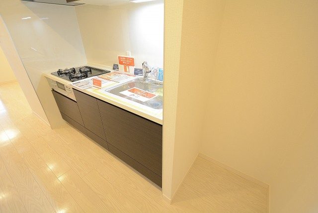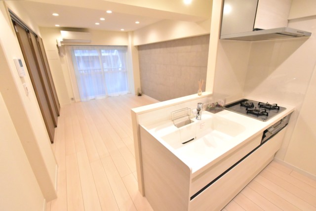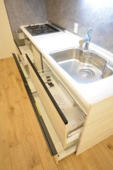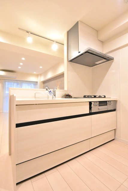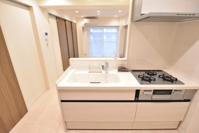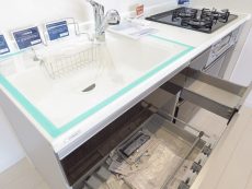 キッチンはカウンタータイプ。開放的で、お料理をしながらでも会話を楽しむことが出来るのが人気の秘密です。リビングのテレビを見ながらお料理なんてことも出来ますよ。