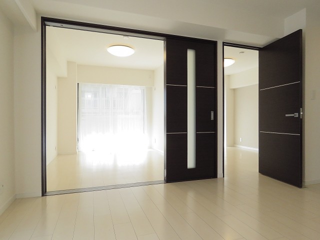 こんな感じでLDKとつなげて使うことも出来ます。合わせて約18帖の広~いお部屋の出来上がり♬ 吊り下げ式扉は床にレールが無いので、一体感が違いますね。状況に応じてオプションがあるのは助かります。