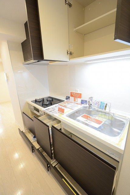 調理台下は引き出し式のスライドキャビネット。出し入れがしやすく、いっぱいに詰めても中の確認がしやすい優れものです。コンセントはこんな所にありました。