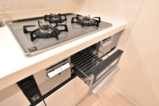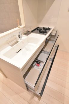 キッチンは浄水機能付き水栓、3口コンロ、収納たっぷりと使い勝手がよさそうです。ちなみにエコカラットはお料理のニオイもペロッと吸収するとか!