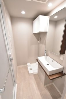 洗面室には洗面台の他に洗濯機スペースと浴室がまとまっていて、脱衣所も兼ねています。洗濯機スペースの上部には吊戸棚も付いているので、洗剤などの洗濯グッズはこちらへどうぞ。