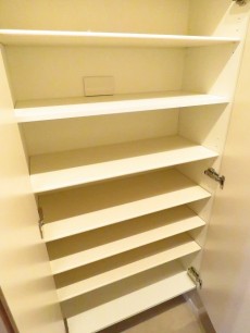 廊下には可動棚付きの物入れも設けられていました。タオルやバスマットなど洗面室内に入りきらない物はこの中に入れておくのがよさそうです。